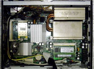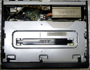 acerは台湾のITメーカーで、パソコンやサーバーを中心に、記憶装置やディスプレイ等の周辺機器を製造・販売しています。日本では比較的最近になって知名度が上がってきましたが、同社の歴史は結構古くて1976年に創業です。当初は工業デザインやマイクロコンピューター関連の輸入販売を行い、その後はボードマイコンの製造・販売に乗り出し、Apple II の互換機を経て現在のAT互換機を中心とするパソコンメーカーとして台頭してきたようです。直近でのデータによれば、世界第4位のシェアを持つパソコンメーカーです。比較的没個性なAT互換機の世界にあって、同社はなかなかユニークなパソコンを多く輩出しています。その点では個人的にMouseComputerと似たイメージを持っていますが、製品の性能や品質面ではacerの方が優れていると思われます。 本機は写真のように縦型を基本としていて、液晶TVの横に置いても違和感の無いデザインをしています。HDMI出力も備えることから、リビングパソコンとしての用途を強く意識しているようです。以前に紹介したMouseComputerのLM-M100Sと似た感じに見えますが、その性能差は歴然としています。価格帯も全く違うので比較するのは酷ですが、実用性を重視すれば迷うこと無くこちらになるでしょう。 本機の概略仕様を紹介すると、CPUにはAthlon 64 X2 5600+(2.9GHz)のデュアルコアを採用、メモリーは標準で2GB、HDDは3.5インチタイプで320GBが搭載されています。光学ドライブはスロットインのスリム型スーパーマルチタイプです。OSはWindows Vista Home Premiumで、メーカーからはXpとVistaのドライバが公開されています。同じ周波数のデュアルコアでもインテルのCore2 Duoより性能が劣るので、処理速度を考えればXpで稼動させた方が快適に使えます。しかし、リビングパソコンとしてホームページを閲覧したりネット動画の再生等も考慮すると、インターネットを中心とした環境が必須となるため、サポートが終了したXpよりもVistaで運用する方が安全です。 さて、今回入手したL5100は起動しないジャンク品で、通電はするもののやはりPOSTしない状態でした。もっともあらかじめ本機の不具合を解消する情報を得ていたので、入手の動機はそれを確認したいという興味からでした。内部にアクセスするには、背面のビスを1本外してサイドパネルをスライドするだけなので簡単です。早速中身を見てみましょう。