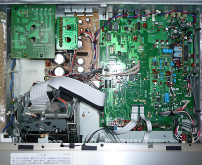 さて、この時代の多くの精密機器には、致命的な弱点となる部品が存在します。これまでに何度も指摘してきた電解コンデンサです。特に1990年代前半の表面実装型の物は劣化が著しく、経年すれば確実に電解液を噴いて部品自体が機能しなくなる上、基板上に流れてパターンや他の部品を腐食する厄介な存在です。故障を回避しようと修理するにしても、部品の全交換は必須となります。30年も40年も前の製品で今でも稼動しているものがあることを考えると、中途半端な技術による結果が残念でなりません。 本機の場合はRFアンプと呼ばれるヘッドと直結する信号処理回路に、問題となる電解コンデンサが使われています。案の定、扱った全数が劣化していました。コンデンサが劣化すると音がブツブツと途切れたり、まったく出なくなる症状が現れます。従って故障品はまずこの部分の不良を疑うのが定石になっています。基板自体はシンプルで信頼性も高そうなので、部品を交換しておけば今後も安心して使えるはずです。なお、後継機のDTC-59ESやDTC-790等も同じRFアンプが使われています。参考までに、シールドケースは必ず付けておく必要があるので、修理後は忘れずに元に戻しておいて下さい。
