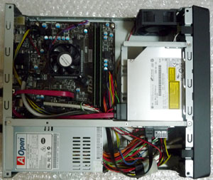 Mini-ITX規格のマザーボードを組み込んだPCとしては、今回はかなり小型の部類に入るものです。ケースはAOpen製のS145で、写真のようにとてもスリムです。縦置きすれば設置面積もあまり必要としません。机の上に置くならこの程度が良いと感じます。小さいながらも光学ドライブ(スリムタイプ)1基を内蔵でき、3.5または2.5インチのHDD/SSDを搭載できます。電源も内蔵しているため、すっきりと収まるのも嬉しいところです。ケースに排気ファンが1基付いているため、内部に熱がこもるのも防げます。電源は160Wと小容量なので、省エネのマザーを念頭に置いて設計されているのでしょう。 この手のケースはCPUにATOM(intel)やE-350(AMD)を搭載するマザーが一般的ですが、もう少し処理能力が高いPCを目指し、前回と同じくAMD製APUを搭載するマザーを選択しました。ただし、こちらで対応するAPUは性能が1ランク下で、より省エネで低価格のモデルになります。今回採用するのはデュアルコアのAthlon5350で、シリーズ中では上位クラスに入ります。それでもマザーボード込みで1万円強と言ったところでしょうか。マザー上の装備も必要最小限と言った感じですが、USB3.0やギガビットイーサーネット等も装備しているため、実用的でコストパフォーマンスの高いPCを目指すには最適です。