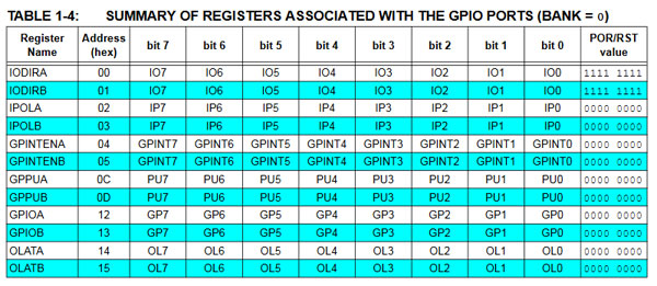 MCP23017の資料を下図に示します。上がICのピン配列、下がレジスタのアドレス表です。通常は図のBANK0を使用しますが、BANK1に切り替えて使用することもできます。パワーオンリセット回路は内蔵しているようですが、通常使用ではHに固定しておきます。