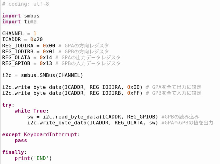簡単なテストプログラムを書いてみました。PORTBのスイッチの状態を調べ、PORTAのLEDを点灯または消灯するものです。無限ループで繰り返し処理を続け、キーボード割り込みで終了します。