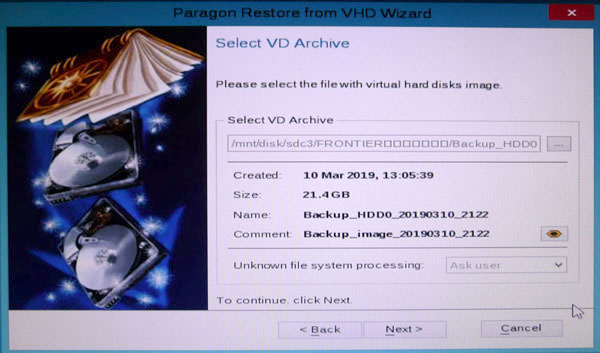 Select VD Archiveで保存してあるリカバリデータを指定します。右のアイコンをクリックするとエクスプローラーが開くので、場所を探して選択して下さい。この時フォルダ等に日本語が使われていると正しく表示されないので、なるべく英語で名前を付けておいた方が良いでしょう。なお、この例でのリカバリは先のデータ作成時とは別のPCのものなので(撮影の都合上)、場所やファイル名、サイズ等は参考程度に願います。指定が終わったらNextボタンをクリックして下さい。