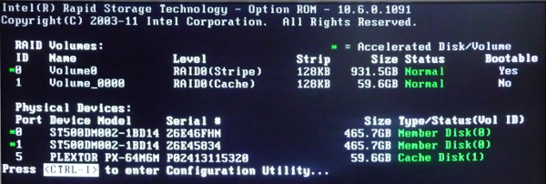 13.ISRTを利用したWindowsの高速化 (2018.7.8) ISRTとはインテル・スマート・レスポンス・テクノロジーの略で、IRST(インテル・ラピッド・ストレージ・テクノロジー)の機能の一部として提供されています。名前が似ているので紛らわしいのですが、後者はハードドライブを複数使用してRAIDを構成し、データアクセスの高速化やデータの安全性を高める技術のようです。どうもインテルのホームページの説明を読んでも直訳的な表現でわかりにくく、やや正確に欠ける解釈かもしれません。なのでこちらは割愛し、前者について解説したいと思います。ISRTは読み出し速度の速いSSDをキャッシュ用に使い、HDDへのアクセス速度を高速化する技術です。最初に補足しておきますが、これはSSDがHDDに比べて極めて高価で、大容量のSSD製品が実現される前の時代のシステム(2012~2013年頃)なので、大容量化と低コスト化を実現した現在では、やや時代遅れの技術にも感じます。ただ、安くなったとはいえ依然として高価な大容量SSDを使わず、安価な大容量HDDと小容量のSSDを組み合わせて高速ドライブを実現できるため、特に古いPCを低コストでパワーアップして延命するのに効果があると思えます。例えるなら、高価な大容量バッテリーではなく、安価な小型の発電機と小容量バッテリーを組み合わせて電気モーターを回す、日産自動車のe-POWERのようなものと言えるでしょう。極めて現実的で実用性の高いシステムだと思います。 そもそも今回ISRTに着目したのは、Windows Vista以降のPCに見られる異常とも思えるHDDへのアクセスにあります。Vistaや7にはデスクトップガジェットにCPUメーターが用意されていますが、これを見ているとCPU的には余裕が十分にあっても、HDDがアクセスしっぱなしになり、処理が停滞して思うようにPCを動かせなくなります。特に起動直後には色々な処理が入り、性能の低いPCでは全く実用にならない程です。初期のXPではさほど頻繁なアクセスは見られなかったのですが、サービスパック3の後期辺りから尋常ではなくなってきました。どうもその頃から重大な問題になってきたセキュリティ関連の処理に原因があるように思います。現在のPCは明らかにセキュリティに処理能力の多くが食われ、本来の性能を発揮できないでいます。その最大のネックになっているのがHDDにあるわけです。いくらCPUパワーがあっても、実作業で体感するのはPCのレスポンスです。HDDの処理待ちで思うように作業がはかどらなければ、確実にストレスはたまります。HDDの処理速度が上がれば、こうした悩みも解決できるのです。 最近では高速で大容量のSSDが安価に供給されるようになったことから、以前に比べてSSDを導入しやすくなりました。記憶媒体全体をSSDでまかなえるようになったことから、ISRTによるハイブリッドシステムも存在意義が薄れ、手軽にHDDからSSDへの置き換えが進んでいるものと考えられます。特にSSDの弱点だった書き込み速度が上がったことで、SSDだけでシステムを構築するのが普通になりつつあります。その方が速度的にも安定性でも有利になったのは確かです。それでもまだまだISRTの優れた点が色あせたわけではありません。破格値となった中古部品を組み合わせて高性能のPCを組もうとする我々にとって、快適な処理能力を得られる1つの方法として大きな魅力があるのです。私もこれまでRAIDは組んだことがありますが、SSDをキャッシュとして使うのは初めてです。どれくらいのパフォーマンスが得られるのか、実際に組んで確認することにしました。 一般的にはHDDとSSD各1基で組むのが普通です。しかし、これだとHDD単体に比べて読み込み速度が劇的に向上しても、書き込み速度はさほど変わりません。読み込みと違ってキャッシュの効果は得られず、HDDの書き込み速度で処理が制限されてしまうからです。そこで今回は更に能力を上げるために、RAID0で組んだ2台のHDDを使い、マザーボード上のmSATAスロットにカード型のSSDを搭載してキャッシュとして利用することにしました。ネットでも複数のHDDを利用した例があまり無いようで、ちょうど手元にそれらの部品があったことからトライしたわけです。効果については、CrystalDiskMarkというソフトで測定して確認したいと思います。システムを構築する細かな方法についてはここでは触れません。概略だけを記載しておきます。 最初にやることはRAID0で2台のHDDを1台のディスクのようにまとめることです。大抵マザーボードにRAID構築の機能が搭載されていますが、私の場合はGIGABYTE製のGA-Z68P-DS3を使いました。ちょうどmSATAスロットも備えていて、今回の目的にぴったりだったわけです。HDDは3.5インチのSATAドライブ、Seagate製の500GBを2台(合計1TB)用意しました。あまり容量が大きくても無駄だし、小さいと処理速度が遅いのが普通なので、そこそこの妥協点というわけです。普通に使用するなら1TBもあれば十分過ぎるくらいでしょう。キャッシュに利用するSSDカードは64GBです。ISRTでは