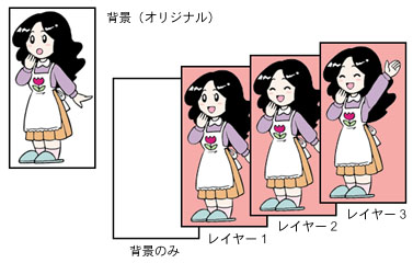 マルチレイヤーは、その上に複数の層が重なっていて、アニメーションのセル画を重ねたような構造になっています。また、重ね合わせやどれを表示するかは自由に選択できます。図では各レイヤーのイラストはピンクの背景となっていますが、説明上わかりやすくするために色付けしたもので、実際は透明でイラスト部分以外は透過します。