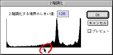 次に「イメージ」メニューで「2階調化」を選択します。すると下のようなダイアログが現れてしきい値(黒白を分けるレベルで、値が小さい程白っぽい画像になる)を調整できるようになります。しきい値を示す△印(赤で囲った部分)をスライドして値を決定します。大抵は左の方に寄せた方が良い結果が得られますが、線が細るので適度にとどめます。