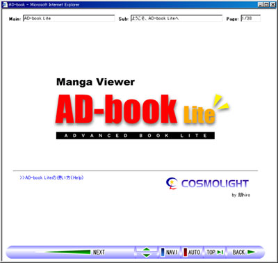 ページ操作と言えるかは微妙ですが、Liteには上下のスクロールボタンもあります。当時はモニターサイズが小さかったことから、細かな文字でも読めるように一般的なA4やB5のドキュメントを表示しようとすると、縦に全部を収めるのは不可能でした。縦のスクロールは必須だったため、操作支援用にスクロールボタンを付けたわけです。1回クリックすると一定量まとめてスクロールするもので、マウスでスクロール操作するよりも遥かに操作が楽になりました。縦のスクロールボタンはその後のAD-BOOKシリーズでも標準装備しています。コントローラーに備わっているのは、他にナビ、オートの特殊機能です。ナビは本を便利に読めるようにナビゲートを行うもので、ボタンをクリックすると下図のようなナビページを表示します。