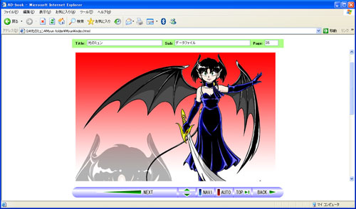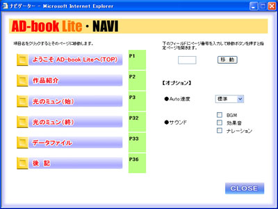 ナビは電子ブックに収められているコンテンツの章タイトル一覧を表示します。紙の本の目次に相当するもので、ページ番号が全体における累積ページ数を表している点も同じです。右の一番上にはページ移動機能が搭載されていて、ページ番号を入力すると直接そのページが開くようになっています。左のページ番号からおおよその当たりを付けることで、目的のページへ到達しやすくしています。その下にはオプション設定機能があり、上述した自動ページ送り機能の他にサウンド(BGM、効果音、ナレーション/音声)のON/OFFを設定します。AD-BOOKは最初からエンターテインメントでの利用を想定していたため、サウンドは必須機能と考えていました。AD-BOOKのコンテンツページはHTMLでも良いので、Javascriptと組み合わせてアクティブかつインタラクティブなページを実現できます。当時もフラッシュと呼ばれる映像を埋め込むことができたため、両者を駆使すれば電子ブックが単なる書籍にとどまらないことは明白でした。そこにサウンドが加わることは、私にとってはごく自然な流れだったのです。