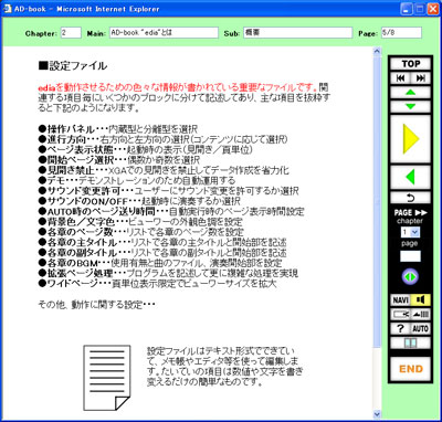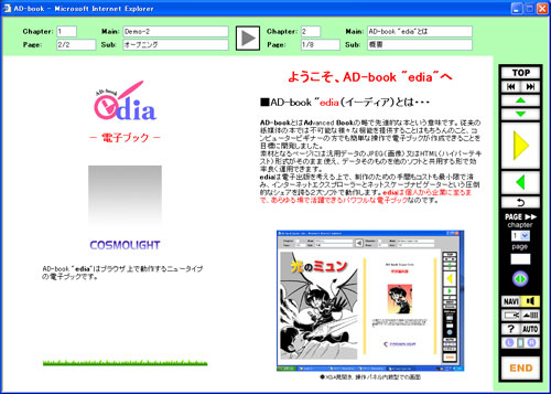 ブック内のコンテンツは章とページで管理しており、長編作品や作品集等のボリュームのある本の電子ブック化に適します。ediaには他の電子書籍には無い様々な特長があります。ediaを含むAD-BOOKシリーズは、本のページデータに汎用性の高い画像(JPEG)とハイパーテキスト(HTML)のどちらでも使用できます。一般的なオーサリングソフトのように専用のデータ形式を持ちませんから、長期に渡ってデータの有効性が保たれます。しかも汎用データですからホームページや他のソフトとデータを共用して効率的な運用ができます。ブラウザ上で動作する電子ブックですから、ブラウザに搭載された柔軟で強力なプログラミング言語「Javascript」を利用して、動的かつインターラクティブなページも実現できます。Javascriptは特別なプログラミングツールも不要で、ビギナーの方にも比較的簡単に扱えるのが特長です。