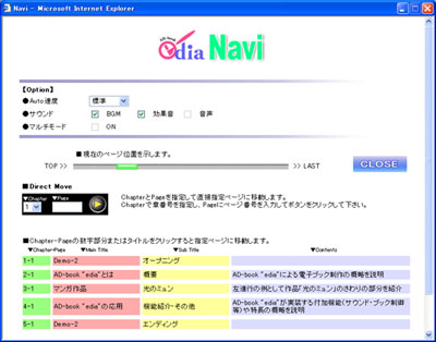 ナビにはゲージの他に様々な機能があります。構成は上から設定、ページゲージ、数値指定による直接ページ移動、タイトルリストの順に並びます。リストには章、主タイトル、副タイトル、概要が表示され、目次を見る感覚で利用できます。情報量を増やしたため、1章を1行に表示する形に戻しました。本のボリュームが大きくなりタイトルリストが長くなっても、スクロールして見て行けば良いので、紙媒体の目次に比べて遥かに使いやすいものです。しかもリンクによって直接目的のページに移動できるので、電子ブックの優位性を実感できるはずです。