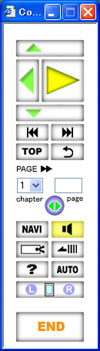 ediaの画面上部にはチャプター(章)、メインタイトル、サブタイトル、現在ページ/チャプター全体のページ数を表示します。見開き時はそれぞれのページ上部に、こうした関連情報を表示します。後述するNAVIやページ移動ボタンと連携することで、本の中を自由に移動したり、現在のページ情報を把握することができます。メインとなるコンテンツを表示するのが、ビューワーの大部分を占める画面中央のエリアです。内蔵型の操作パネルの場合(ediaは操作パネルをリモコンのように別ウインドウに切り離す事が可能)は右側にコントローラーが表示され、必要十分な機能を提供します。操作性を最重点にレイアウトしたコントローラーは、頻繁に使用するボタンを大きくしたり、配置に工夫を凝らしたりと実用性を追求しました。頁単位やチャプター単位での移動、直接指定や履歴逆行、目次やしおりでの移動等、あらゆるページ移動手段を提供します。
