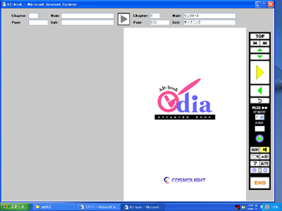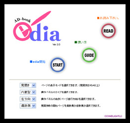 SuperLiteによる進化の流れを発展させ、何よりも高機能を目指して取り組んだのがAD-BOOK「edia(イーディア)」です。この名は[e」と「media」の造語です。電子の本を意味する「electronics」、娯楽である「entertainment」、簡単に扱える「easy」、紙媒体を使わない「eco」といった具合に、「e」には色々な意味が込められています。そして電子ブックという媒体「media」と合わせて「edia」としました。この電子ブックで初めて商用(電子出版)を強く意識し、新しい電子ブックの可能性を追求することにしたのです。ediaには当時持てる技術と知識を駆使して、電子ブックに必要と思われるあらゆる機能を搭載しました。唯一実現できなかったのは、edia自身の機能によってコンテンツの拡大・縮小ができなかった点です。画像はともかくHTMLのページでは元来不可能なことで、拡大・縮小はブラウザ自体で行う以外に方法はありません。ediaでは標準と拡大の2種類のデータを用意して、表示モードを切り替えることで対応しているのです。