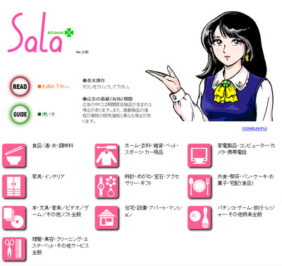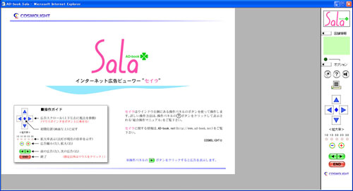 古いデータを整理していたところ、Salaのプロモーション用サンプルが残っていました。そこでコンテンツの一部を伏せてビューワーの見本を公開しようと思います。当時は通信速度が遅かったため、広告画像のデータ量を小さく抑えざるをえませんでした。そのため画像がやや荒い点はご容赦下さい。古い環境でしか動作しないため、Internet Explorer 6でのみ閲覧できるように制限をかけています。もしも実行できる環境をお持ちであれば、どんなものか実物に触れて体感頂けます。Javascript(アクティブコンテンツ)の動作を禁止している場合は、インターネットオプションの詳細設定で許可するようにして下さい。