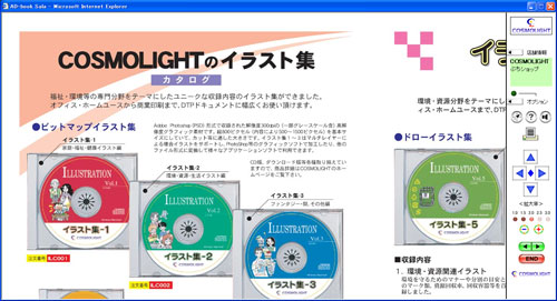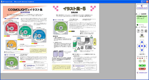 2倍に拡大して表示したのが下図です。倍率はコントローラー内のインジケーターで確認できます。+、-ボタンで自由に拡大・縮小が可能です。スクロールは方向ボタンにマウスポインタを乗せると動作します。右ボタンなら広告が左に動いて右の部分を見て行くことができるわけです。方向ボタンの中央をクリックすれば、初期状態の表示位置に戻ります。主にチラシ広告を想定していたので、こうしたボタンを操作することで、見たい商品や価格等も素早く閲覧できたわけです。本当は現在のマップデータのようにマウスでの自由な操作が理想なのですが、当時の技術では実現できませんでした。