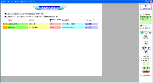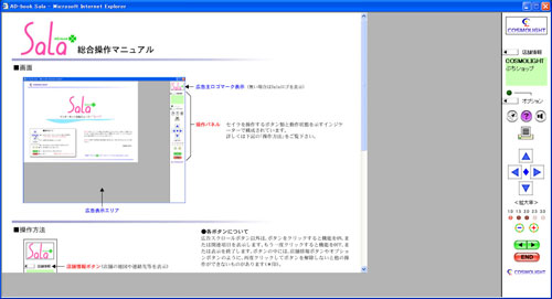 コントローラーの説明に戻ると、右のパネルの中ほどにはSala独自の機能にアクセスするボタンがあります。例えば?ボタンをクリックすれば、使い方のマニュアルを表示して操作を再確認できます。他に登録されている店舗をリストから直接選んで広告を表示するナビ機能や、店舗のテーマソングと言ったゆかりの音楽を鳴らしたり、着目する広告を印刷することもできるようになっています。広告自体はJPEG画像を基本にしますが、HTMLドキュメントを使うこともできるため、広告自体を動的なコンテンツの対象にすることも可能です。チラシ広告の電子ブック化を目指したSalaは、広告の分野でもエンターテインメントのように楽しめる要素を備えていたわけです。