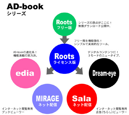 これまでAD-BOOKシリーズのバリエーションを紹介してきましたが、ここで総括してみましょう。最後のビューワーとなったROOTS及びROOTS FREEをリリースした時の全体イメージは下図のようになります。Lite及びSuper Liteは既に後継モデルに移行していたので除外しています。AD-BOOKは長い間AD-bookのロゴで通してきました。先進を意味するadvancedのADを強調する意味を込めてのことですが、ロゴとしてはバランスが悪いため、最終的に全て大文字のデザインに変更しています。(下図はそれ以前に作成したもので、まだAD-bookとなっています)
