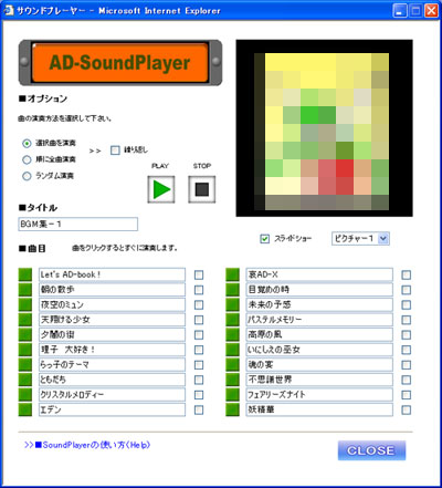 AD-SoundPlayerはシンプルなプレーヤーですが、なかなか豊富な機能を備えています。下図は再生中のもので、左上部には主操作部(オプション機能、再生、停止)、右上部は画像表示部(固定/スライドショー)、下は登録曲リスト兼ダイレクト再生ボタンになっています。曲は最大で20曲登録可能です。普通はリストの曲名をクリックすれば聴きたい曲が再生され、終わると停止状態に戻ります。上の停止ボタンを押しても同様で、曲の再生中に他の曲を選択すればそちらを優先して再生します。曲のリストの右にはチェックボックスがあり、任意のボックスにチェックをすれば順にまとめて再生することができますし、オプションでランダム再生を選択しておけば、プレーヤーが無作為に曲を再生します。また、繰り返しを選択しておけば、一連の再生を繰り返し実行します。画像表示部は写真やイラスト等を固定表示、またはスライドショーとして一定間隔で切り替え表示します。画像は任意の画像データをいくらでも登録でき、3個の画像用フォルダーを用意してあるため、いずれかを選んでスライドショーを楽しめます。静かに音楽を聴きながら、まったりとスライドショーを眺めるのも一興ではないでしょうか。