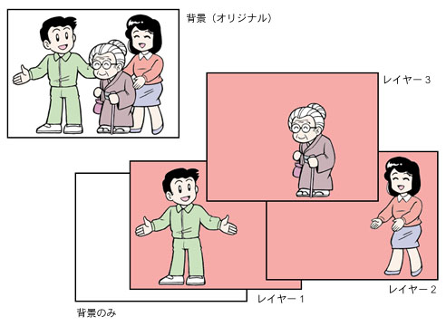 オリジナルのイラストは、背景レイヤーという一番下のレイヤーに描かれています。初期のイラスト集(一般の市販イラスト集も含めて)は、このレイヤーのみが唯一のレイヤーでした。マルチレイヤーは、その上に複数の層が重なっていて、アニメーションのセル画を重ねたような構造になっています。また、重ね合わせやどれを表示するかは自由に選択できます。図では各レイヤーのイラストはピンクの背景となっていますが、説明上わかりやすくするために色付けしたもので、実際は透明でイラスト部分以外は透過します。