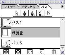 既にイラストに合わせて1つ又は複数のマスクパス(クリッピングパス)がパスパレットに用意されている場合は、適切なマスクパスを選択します(上図参照)。マスクパスを有効にするか無効にするかはクリッピングパスオプションで選択できます。パスパレットにある「クリッピングパス」を選択し、ダイアログで必要なパス名を選択して下さい。パスパレットを選択した状態ならイラスト上にマスクパスが表示されて確認することができます。イラストを描き変えた場合等は、新たにパスを作成・保存し、それをマスクパスにして下さい。(マスクパスとして選択されたパスは、Macintoshの場合には名前が2重強調表示されてすぐにわかります)