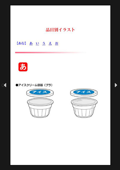 イラスト集見本帳はただ見るだけでなく、イラストを活用する目的で作られています。例えばPCで上図のように表示されたとすると、右のメイン表示部分のスクリーンショットを撮れば、ビットマップデータとして取り出すことができます。スクリーンショットはフリーウェア等を利用すれば良いですし、Windows7ではSnipping Toolの名でメニューの中にも登録されています。こうしたツールによって切り出したのが下図です。これはイラスト集-D2の最初に掲載されている品目のページです。