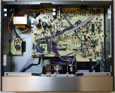 本機もまた、バブル真っ最中の1989年に登場したカセットデッキです。Liverpoolと言う名称で呼ばれた高級システムコンポの1つで、2ヘッドでオートリバースのシングルデッキながら、単品で価格が12万円(税別)もした異色の製品です。高価なオーディオ用部品をふんだんに使い、デザインもカセットデッキらしからぬスタイリッシュなもので、いかにもバブル時代の申し子といった感じがします。サイズもコンポとしては大型の部類ですが、デザインを優先し過ぎたせいかボタンも小さく文字も読みにくいので、使い勝手はお世辞にも良いとは言えません。しかも表示部が液晶タイプで見にくく、扉の中にあるので普段は動作状態も良くわかりません。3ヘッドのカセットデッキが買える価格帯であることから、あの時代で無ければあえて本機を選ぶ理由は無さそうです。それほど数が売れたとも思えないので、今となっては希少性は高いのかもしれません。ネットで検索しても情報がほとんど得られず、詳細はよくわからない製品です。 さすがに製造から25年以上経過しており、本機を入手した時には再生してもテープが回らず、すぐにモーターが停止する状態でした。外観は高級感があって状態もかなりきれいだったので、とりあえず修理を試みることにしました。カバーを開けてまず驚いたのは、内部が長期間経過したとは思えない程ピカピカだったことです。保存状態が非常に良かったようで、恐らく通電も短期間だったに違いありません。幸いキャプスタンベルトが伸びて緩んでいただけのようなので、例によってゴムシートから平ベルトを切り出し交換することにしました。ところが、カセットメカユニットを外そうとしたら、恐ろしく入り組んだ筐体設計がされていることがわかり、ほとんどバラバラに近い状態にまで分解しなければならなくなってしまいました。ビスがほぼ統一されていたのは救いでしたが、正直なところ二度とバラしたくないと思います。ほんの少し配慮されていればメカだけ簡単に外せたのは明らかで、バブルの頃だけあって難解なパズルのごとく趣味で作ったような代物でした。修理時に常々感じることですが、メーカーは修理することを前提に設計してはいません。最近は廃棄物のリサイクルの気運が高まり、分解にも配慮する例が増えてきましたが、それでもまだまだ十分では無いと思えます。メーカーにとっては修理して長期間使用されるより、買い替えを狙って売り切りとした方が都合が良いからなのでしょう。 カセットメカユニットを取り出すまでが大変でしたが、ユニット自体も同様に難解な作りでした。おかげでキャプスタンベルトを交換するために、これまたかなりあちこち外さなければなりませんでした。いつも適当に部品をバラしてきちんと整理しないので、途中で元に戻す自信が無くなってしまいましたが、幸いどうにか動作するように組み上げることが出来ました。メカは4モーター構成で、キャプスタン、リール、ローディング、ヘッド移動用に独立しています。