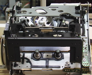 トレイ開閉用のゴムベルトも伸びて劣化しているので交換します。洗浄してベルトをかけ直すだけでも延命効果があるので、部品調達が困難な場合は試してみると良いでしょう。また、リールモーターに付いているプーリーが軸の緩み(既にヒビや割れがある場合も)で滑る可能性もあるため、念のためネジロックかポリプロピレン用の接着剤等で補強しておきます。 本機でもう1つ致命的な問題と言えるのが、リールモーターの劣化によるトルク不足です。リールの回転力が弱くなるために、キャプスタンによって送り出されたテープの巻き取りが間に合わず、テープがたるんで絡み痛んでしまいます。最悪、高価なテープが切れたり折り目が付いたりして、非常に厄介な問題を起こします。更に、早送りや巻き戻しでテープが止まってしまう症状も出ます。ソフトウェアサーボのため、安易に印加電圧を上げてトルクアップするわけにもいかず、モーターを代替品に交換するにしても調整が必要になり、きちんと対処しないと録音テープの互換性の問題も生じます。つまり中古整備が極めて困難で、経年劣化を承知で騙し騙し使わざるを得ないのが現状なのです。デザインが良いだけに、長く使いたいと願うユーザーにとっては実に残念な製品です。
