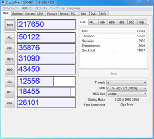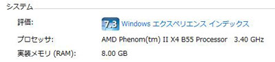 ここで注目すべき点があります。CPUの項目ですが、実際に搭載しているのは左側のPhenom II X2 555BEです。それがシステム上は右側になっています。実はこのモデルはX4と同じダイが使われており、コア2個を無効化することで2コアにしています。マザーボードには無効化したコアを復活させる機能が搭載されており、運が良ければ4コア化してPhenom II X4にすることができるのです。ただし、AMDが保証するものでは無いので、歩留まりを上げるために不良コアを無効化したものと区別が付きません。4コア全てを有効化できるとシステム上はB55と認識します。実際に問題無く動くかは動作させてみないとわからないので、ややバクチ的な要素があります。また、BEと付くのはBLACK EDITIONのことで、クロック倍率フリーのモデルに付与されています。オーバークロックが手軽に出来ることから、こうしたユニークな戦略もマニアに根強い人気がある秘密だと思います。せっかくのBEモデルなので、オリジナルの3.2GHzから3.4GHzへとプチ・オーバークロックしました。 OSはWindows7 Pro(64bit)のためメモリーを8GB実装し、多目的に使えるようにグラフィックボードを追加して性能向上を図っています。レスポンスを落とさないようシステム用にSSDを、データ用もアクセスの高速化のためHDD2基をRAID0で構成しています。これらによってベンチマークも20万以上を目指しました。