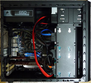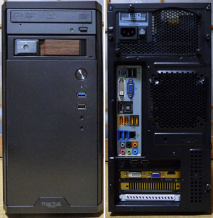 PCと言えば「intel入ってる」と圧倒的なシェアを持つインテル社に対して、果敢に対抗しているのがAMD(Advanced Micro Devices)社です。元はインテルのセカンドソースを製造するメーカーだったようですが、途中からインテルがそれを認めない方針をとったため、独自の互換路線を進めることになりました。元々高い技術力を持つ同社だけに、性能面でもインテルと抜きつ抜かれつの熾烈な戦いを繰り広げています。互換と言うことで低価格路線を強いられる面もありますが、逆にコストパフォーマンスが良いことから商業的にも健闘して現在に至ります。AMDのCPUと組み合わせるチップセットのグラフィック性能が高いこともあり、安価で高性能なマザーボードを入手できるとあって、マニアを中心に根強い人気があります。グラフィックチップで有名なATI社を買収してからは、CPUにGPUを統合したAPUを開発するなど、近年その存在感は益々増しています。 今回はAMD系のマザーボードでGIGABYTE社のGA-880GMA-UD2Hを採用しました。手持ちの部品の整理を兼ねて、全体の性能のバランスを考慮しつつ、ある程度の高性能を狙います。マザー関連は後ほど詳細をレポートしましょう。組み込みに使用したケースはFractal Design製のCore 1100で、設計はスウェーデンで行われているようです。北欧スカンジナビアデザインとのコピーが同社のホームページで紹介されています。写真のようにコンパクトで無駄の無いシンプルなデザインをしており、価格も安価に抑えられています。フロントパネルはプラスチックですが、アルミのヘアラインのような処理を施して高級感を演出しています。ケースの板金は薄手でやや頼りない印象ですが、成型を工夫するなどして結構剛性がありながら軽量です。 ファンを前部に1基搭載し、後部と左側面に各1基取り付けスペースがあります。HDDの搭載部分が独特で、板状のマウンタに3.5インチなら2基、2.5インチなら3基固定でき、側面からマウンタごと着脱できるようになっています。そのおかげで比較的コンパクトでありながら、ケーブル類の取り回しもしやすく、メンテナンス性も良好になっています。またHDDの振動を伝えないように、ビス部分に防振ゴムが取り付けられています(3.5インチHDDのみ)。5インチベイは2基あり、光学ドライブ等が取り付けられます。昨今のトレンドとは異なり、電源は上部配置で裏面側の側面には配線スペースも無く、意外にもオーソドックスな形でまとめられています。