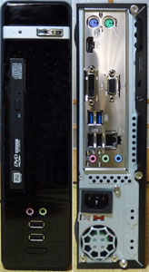 Mini-ITX規格のマザーボードを組み込んだPCとしては、今回はかなり小型の部類に入るものです。ケースはAOpen製のS145で、写真のようにとてもスリムです。縦置きすれば設置面積もあまり必要としません。机の上に置くならこの程度が良いと感じます。小さいながらも光学ドライブ(スリムタイプ)1基を内蔵でき、3.5または2.5インチのHDD/SSDを搭載できます。電源も内蔵しているため、すっきりと収まるのも嬉しいところです。ケースに排気ファンが1基付いているため、内部に熱がこもるのも防げます。電源は160Wと小容量なので、省エネのマザーを念頭に置いて設計されているのでしょう。 この手のケースはCPUにATOM(intel)やE-350(AMD)を搭載するマザーが一般的ですが、もう少し処理能力が高いPCを目指し、前回と同じくAMD製APUを搭載するマザーを選択しました。ただし、こちらで対応するAPUは性能が1ランク下で、より省エネで低価格のモデルになります。今回採用するのはデュアルコアのAthlon5350で、シリーズ中では上位クラスに入ります。それでもマザーボード込みで1万円強と言ったところでしょうか。マザー上の装備も必要最小限と言った感じですが、USB3.0やギガビットイーサーネット等も装備しているため、実用的でコストパフォーマンスの高いPCを目指すには最適です。