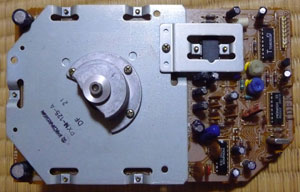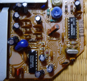 PCばかりの話題が続いたので、今回は趣向を変えてオーディオ機器を紹介します。今や音楽を聴くなら携帯音楽プレーヤーと言われるデジタル全盛のご時勢で、CDすらも昨今では衰退しつつあります。そんな中で、更に古い時代のレコードが脚光を浴びています。レコードと言えばアナログの最たるもので、取り扱いも面倒で一時は完全に駆逐されたかに見えました。ところが、その面倒なのが逆に魅力のひとつでもあるようなのです。 音楽とは文字通り音を楽しむものです。携帯音楽プレーヤーは手軽に音楽を聴けますが、ながらで聴くことが多くて本当に音を楽しめているのか疑問に思うこともあります。その点、レコードは準備に手間がかかるのでじっくり聴こうとする身構えができます。個人で手を入れる余地が多々有り、ウエイトの設定を変えるだけでも音が変化すると言われます。更に、その気になればカートリッジや針、トーンアーム、RCAケーブル等もカスタマイズできます。携帯音楽プレーヤーでは、せいぜいヘッドフォン(イヤフォン)を変えるくらいしかできません。 最近は個性を重視する人が増えてきたこともあって、音をカスタマイズできる点が魅力に感じるのでしょう。人気が上昇していることもあって、新曲発表の際にメディアとしてのレコードを併売するケースも出てきました。少し前には新たにレコードプレーヤーの新製品も発売されるなど注目を浴びています。 私もこれまで複数台レコードプレーヤーを所持してきましたが、レコードの衰退と共に手放してしまいました。全てベルトドライブだったため、ゴムベルトが劣化して使えなくなったと言うのが主因です。ダイレクトドライブは魅力的でしたが、当時は高価で手が出ませんでした。直近になってようやく、今回ご紹介するダイレクトドライブのPL-707を手にしたわけです。元々は父が使用していたもので、40年近く前の商品です。マイコンを搭載したフルオートプレーヤーで、レコードを演奏して終えるまでの一連の動作を自動で行ってくれます。ただし、レコード盤のサイズや回転数を自動認識してくれるわけでは無いので、厳密的にはフルオートとは言えません。 相当の年数が経過しているのにもかかわらず、つい最近まで正常に動いていたのですが、先日使用しようとしたら回転数が定まらず、まともに演奏を聴くことができなくなっていました。見るとPLLのロックランプが点滅し、制御がうまくできていないことを示しています。さすがに年数が経過してもうだめかと思ったのですが、念のため修理を試みることにしました。ダイレクトドライブのため、駆動系の劣化の可能性は低いと思われます。確信はありませんでしたが、原因はPLLの制御回路の故障ではないかと当たりを付けました。 本機の場合、分解は比較的簡単です。まずは本体を裏返して4つのインシュレーターを外します。結構深く止まっていますが、インシュレーターを左にぐるぐると回せばやがて外れます。後は背面板を止めているビスを外せば板も外れます。プレーヤー内部はいたってシンプルで、トーンアームの制御部、操作パネル部、電源回路、ターンテーブル駆動部と大まかなブロックに分かれています。ターンテーブル駆動部は電源回路の下(裏から見て)にあります。配線が邪魔ですがビスを外せば簡単に外れて電源基板を移動できるので、少しよけてターンテーブル駆動部を止めているビスを外します。駆動部にはダイレクトドライブモーターが乗っていて、駆動部回路ごと取り出すことができます。下図は取り出した駆動部を部品側から見たものです。モーター(基板の左部分に搭載)は驚くほど薄くて軽く、もっと重厚なものと思っていた想像とは異なりました。