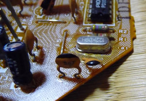 ネットで調べたところ、本機の修理例は見つかりませんでしたが、参考になりそうな他の事例はいくつか見つかりました。それらを総合すると、当時の機器は電子機器で度々問題になるコンデンサの劣化は少ないようで、電源も含めてコンデンサの交換で直る可能性は低そうです。コンデンサはパルス性の高周波によって容量抜け等の劣化が進むと考えられますが、アナログ時代の製品は元々の品質が良い(当然メイドイン・ジャパン)ことに加え、極端な高周波ノイズにさらされることが無いため寿命が長いようです。次に考えられるのが調整用のボリュームの劣化ですが、それだと45または33回転のどちらかが不安定になる可能性が高く、両方共ダメとなると別の原因と考えた方が合理的です。最終的に制御ICか発振素子(クリスタル)の故障と推測しました。いずれも半永久的な寿命の素子で、本来であれば故障は少ないものです。 そんな中で、同じメーカーの別機種でクリスタルを交換して修理した事例が見つかりました。本機の発振素子は下図の右下の銀色の部品です。型番らしきものは書いてありますが、検索しても周波数等のデータが得られませんでした。シンクロスコープ等があれば一発で故障を判断できますが、何も測定器が無いので賭けるしかありません。どの道、修理できなければ廃棄するしか無い代物です。ここは勘を信じてクリスタルを交換してみます。時代的にもそれほど修理事例との差は無く、同じメーカーなら回路も同様だと推測して、同じ周波数のクリスタル(12.288MHz)を発注しました。