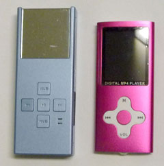 入荷仕立てのジャンク箱に放り込まれていた携帯音楽プレーヤーです。第四世代のiPod nanoにかなりよく似たデザインの商品に見えます。パッケージ入りで見たところ新品のようだった(実際、新品だった)ので、早速ゲットしてみました。前にMP3のプレーヤーを紹介しましたが、販売されていた店は異なります。最近はこの手の型落ち品が多く出回っているのでしょうか。こちらは一品物で、他に第三世代のiPod nanoによく似たモデルも1個ありました(こちらも恐らく新品)。ついでに購入しておけば良かったと悔やみます。 前回入手したMP3プレーヤーと同様に、説明書やケーブル、イヤホン、更にソフトまでも完備したまっとうな商品でした。商品の作りもかなり良く、本家のiPodと比べればもちろん様々な面で劣りますが、商品としては十分良く出来ていると思います。MP3モデルで改良すると良くなる点を列挙しましたが、かなり満足いくレベルで改良していることがわかります。しかも液晶パネルを搭載して、MP4の動画までもが再生できる代物です。発売元の会社が同じ(社名は異なるが同じ住所)なので、恐らく製造メーカーも同じだと推測します。こんなわずかな期間(たぶん3年位です)で、これほどの進化を遂げたとはまさに驚きです。外観上からも雲泥の差が見て取れます(下の写真と比較)。