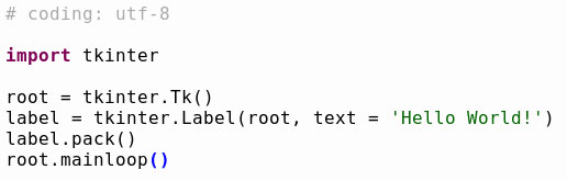 プログラムの説明に戻りましょう。上記プログラムを実行すると小さなウインドウ一杯に文字が表示されるのがわかります。ウインドウサイズを指定しないため、文字を最小限に表示する形になるようです。もしかすると環境によっては適当なサイズ(デフォルト)のウインドウが表示されるかもしれません。それぞれの命令については、テキストの説明を参考に願います。概略はこうです。最初にTkinterのライブラリをインポートし、次にベースとなるTkオブジェクトのインスタンスを生成します。変数名は慣例に従ってrootにしています(名前は自由です)。そしてメインとなる文字表示のLabelウィジェットを生成し、pack()メソッドによってそれを配置します。最後にmainloop()メソッドを実行して表示を続けます。