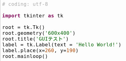 ついでに少し応用して、ウインドウサイズは(ヨコ)600×(タテ)400ピクセルで指定し、文字はウインドウの中央辺り(260, 190)に置くことにしましょう。場所を指定するためにpack()の代わりにplace()メソッドを使います。ウインドウ名は「GUIテスト」、ウインドウ内の表示文字は「Hello World!」にします。