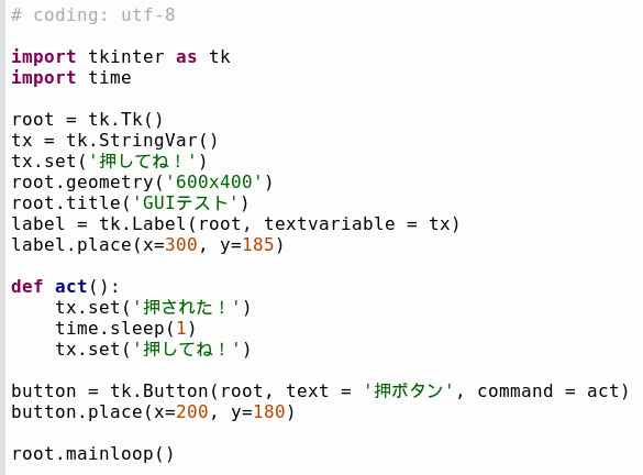 一般的なウインドウにおいて、必要な部品を指定場所に表示するという最も基本的なことが可能になったと思います。次はテキストに従って色々なウィジェットを置いて実験を続けます。最初はButtonウィジェットです。テキストではボタンを押すと表示が変わるようにしています。少しアレンジしてウインドウは上記のサイズで実行します。ボタンと文字はウインドウ中央付近で、場所は何回かトライして適当な位置を決めました。テキストでも書いているように、ボタンが押されて表示を変えるだけでは、次に押した時に何も変化がありません。そのため一定時間経過後に元の表示に戻す処理を加えています。下図が最初に書いたプログラムですが、実はこれではうまく動きません。実際に試してみればわかります。