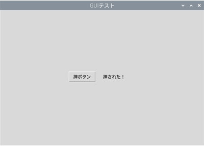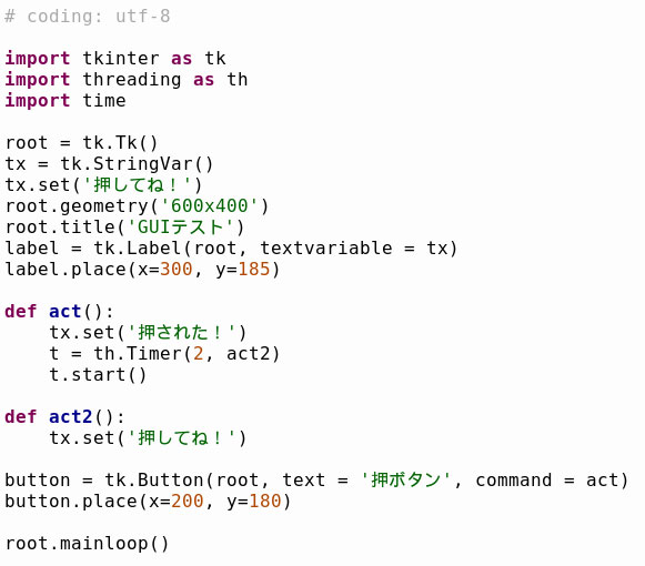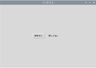 ここではラベル表示を「押してね!」から「押された!」に変更した後に、タイマーで1秒の時間待ちを入れています。ところが、文字変化はタイマー待ちの後になってしまい、結果的に次の「押してね!」がすぐに実行されて文字の変化がわかりません。試しにタイマー待ちとその後の「押してね!」の命令をコメントアウトすると、ボタンを押した時に「押された!」に変わることがわかります。なぜこんなことになるのか正確にはわかりませんが、sleep()メソッドは一時停止命令なので、文字変化を画面表示する前に停止状態になってしまうのだと思います。ハードウェア絡みで恐らく画面表示の変更には時間がかかり、表示変更が間に合わないのではと推測します。それで停止が解除された瞬間に表示が復帰しているのではないでしょうか。Pythonのバグの疑いもありますが、やはり不確実な命令は避けた方が賢明です。この回避策として、タイマー割り込みを利用した形に変更してみます。そのためthreadingモジュールをインポートしています。なお、待ち時間はより確認しやすいように2秒としました。