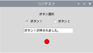 それでは次にRadiobuttonウィジェットに移ります。少々欲張って、テキストボックスと絵を描くを一度にやってみましょう。ラジオボタンを2つ作って、各ボタンをクリックするとテキストボックスにそれぞれのボタンが押されたことを表示し、更にその下のランプが黒からボタン1なら赤に、ボタン2なら緑にします。オプション類の説明はテキストを参照して下さい。