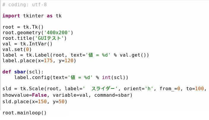 ところで、テキストはTkinterの頭文字が大文字になっていますが、Pythonのバージョン3ではtkinterと全て小文字にしないとエラーになります。調査したところ、バージョン2までは逆にテキストのように記述しないとエラーになるようです。print文の変更といい、こういった重要コマンドの変更は混乱の元なのでやめて欲しいものです。本来であれば互換性のために両方を許容すべきで(ツールとしては洗練されていないかもしれませんが)、どうもLinux系は有志による開発のせいか、いつまでたっても自作気分が抜けなくて困ります。変更される度にプログラムを修正ではたまりません。いずれにせよバージョン3以降は記述に注意して下さい。