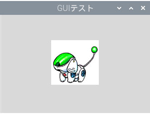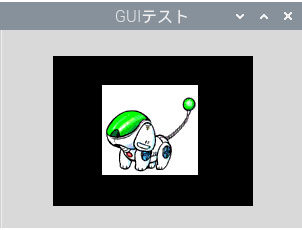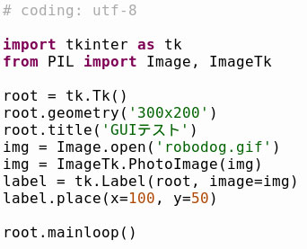 最後にPhotoImageを使ってウインドウに画像を表示してみましょう。テキストではコラム扱いですが、GUIパネルを作る上で使用する機会は多いと思います。覚えておいて損は無いでしょう。表示するのは当サイトのシンボルの「robodog」です。Tkinterで画像を扱うにはクラスImageを使います。具体的にはサブクラスであるカラーを扱うPhotoImageの利用です。簡単な例としてLabelウィジェットで画像を表示してみます。左がプログラム、右が実行結果です。画像はgifアニメですが、静止画状態の表示になっていました。