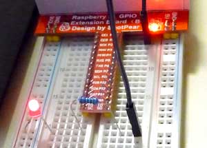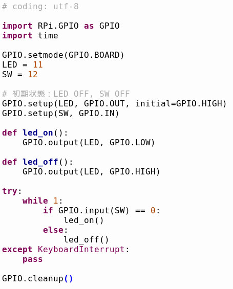 ●ブレッドボード上の配線 LEDの回路は前回のものをそのまま使用します。今回のボタン入力にはGPIOコネクタの12番ピンを使います。手元のT型変換コネクタではP1(GPIOではP18に対応)と書かれていました。プログラムを実行するとLEDを消灯したまま待機状態となります。ボタンを押すとその間だけLEDが点灯し、離すと消灯します。このような単純なテストでは関係ありませんが、実際のスイッチはチャタリングと言って、ボタンを押したり離した瞬間にオン/オフを短時間繰り返す性質があります。チャタリングの影響を除去するために、ハードウェアではコンデンサと抵抗で急峻な振動波を平滑します。また、ソフトウェアではボタンの状態が変化したごく短時間後に再度ボタンの状態をチェックし、同じであれば変化したことを確定します。チャタリングは時として重大な障害になることもあるので、実際の応用時には注意すべきことです。 |