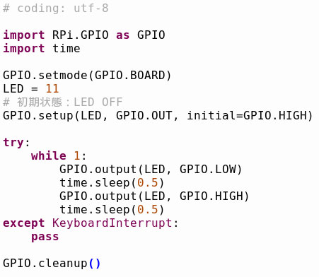 ●制御プログラム 保存をするために新しいウインドウを開いてプログラムを記述します。 点滅はタイマーを使って0.5秒間隔でLEDをオン・オフすることで実現しています。無限ループになっているので、プログラムを実行すればずっとLEDが点滅し続けます。これを終了させるために、無限ループの例外処理で、キーボードによる割り込み(Ctrl+Cキー)を許可しています。そして、最後はGPIOを開放して終了します。 |