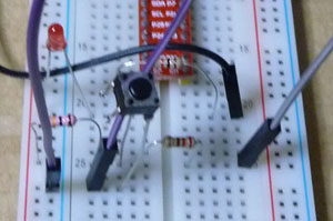 LEDが点滅することがわかったので、次はブレッドボードにボタンを用意して制御入力とし、ボタンのオン/オフによってLEDの点灯、消灯を行います。単純な事例ですが、両者を組み合わせることで入力の状態によって出力の状態を変える、基本的な入出力をマスターできます。