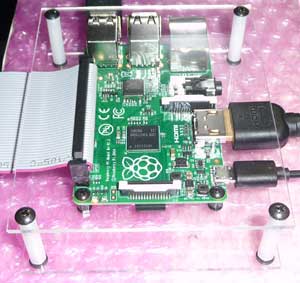 ●コンピューターのケーブル接続状態 左端がGPIOコネクタで、フラットケーブルでブレッドボードと結びます。ついでに無線LANを使えるようにしました。写真では奥になるので見えませんが、Buffalo製のWLI-UC-GNMをUSB端子に挿してあります。別途ドライバは不要で挿せば認識します。 |