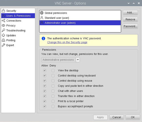 3.一番上のSecurity項目で、右の設定の中にあるAuthenticationをVNC passwordに変更します。新しいパスワードが求められるので入力します。これはシステムに設定したものと同じでも大丈夫のようです。私はそのまま使いました。セキュリティを重視するなら別のものにした方が良いかもしれません。ネット情報ではこれで接続されるとありますが、私の環境ではだめでした。