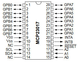 MCP23017の資料を下図に示します。上がICのピン配列、下がレジスタのアドレス表です。通常は図のBANK0を使用しますが、BANK1に切り替えて使用することもできます。パワーオンリセット回路は内蔵しているようですが、通常使用ではHに固定しておきます。