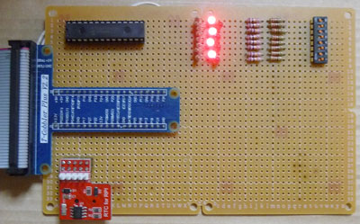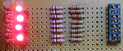 実験とは言えブレッドボードで配線するには大掛かりになるので、市販の蛇の目基板に組むことにしました。入力ポートに関しては、誤って出力に設定して回路をショートしないように、回路上に保護抵抗を入れています。入力側の回路次第では閾値に問題が出る場合があるため、実用回路では抵抗値等も再検討すべきだと思われます。ただし、取り扱いミスに注意すれば本来は不要なものです。因みにアナログテスターでスイッチ部の電圧を測ろうとすると、OFF(High)でもかなり電圧が下がってLowと判断してしまいました。実験ではディップスイッチの状態を調べて、対応するビットのLEDを点灯/消灯します。
