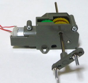 キットを組み立てると下図ようになります。説明書通りギアや軸受けにグリスを塗っていたら、手が油でベトベトになってしまいました。組み立ては簡単なので、15分もあれば完成すると思います。途中のギアに簡易的なクラッチ機構も入っていて、なかなか良くできていると感心しました。