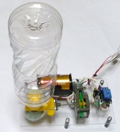 定格の1.5Vだとモーターの回転が遅いため、栓の開閉にやや時間がかかります。3Vだと回転は程良いのですが、カムが惰性で回り過ぎて再びスイッチが入ってしまうため、感触としては2V程度が妥当なところです。本当はカムの溝を長くして対処すべきですが、エポキシで軸に固定してしまったため修正が困難なことから現状での妥協となりました。確実な動作の方が重要なので、乾電池1個で1.5V駆動とします。モーターの駆動時間はかなりアバウトで、実際に使用した感触で適当なタイミングを図っています。下図は装置の全体像になります。水タンクはペットボトルの空きボトルを流用しています。タンクが汚れたり痛んでも簡単に取り替えられて便利です。