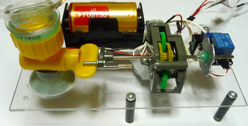 拡大したのが下図です。一番右にあるのはモーターをON/OFFするリレーユニットで、その左にカムが見えます。中央はギアボックス、左はペットボトルと水栓コック、奥がモーター駆動用の電池になります。リレーユニットにはGPIOに直結できるようにトランジスタ・ドライバが入っているので、駆動回路が簡単になります。