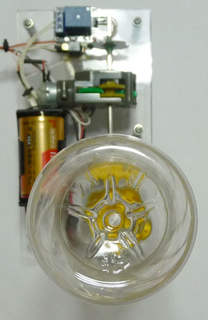 栓と栓回転アーム部を拡大しました。2本のビスが栓を挟み込むようにしています。アーム部は左回りに回転します。とても原始的ですが、カムのメカニカルな動きがあって、いかにも電子工作と言った趣です。
