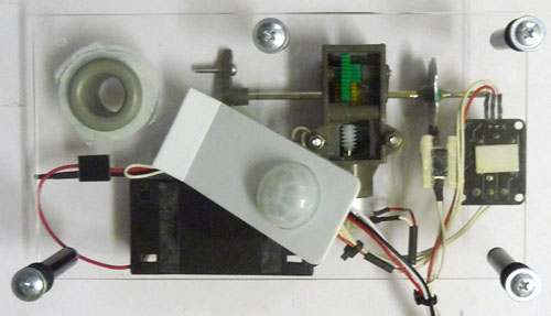 これをアクリル板のベースに取り付け、更に水栓コックを着脱できるように、取り付けを工夫します。実用化を重視するなら、メカ部分や電気系統に水がかからないよう防水を考えねばなりません。更に屋外なので防塵対策も必要です。(今回はそこまで望みません)